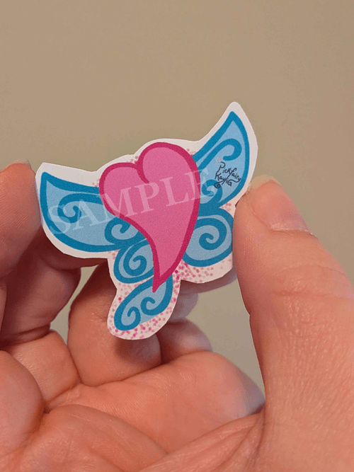 This sticker is inspired by one of my Twitch Emotes, it's a heart with fairy wings! The added pick sparkles at the bottom are there for extra effect :3