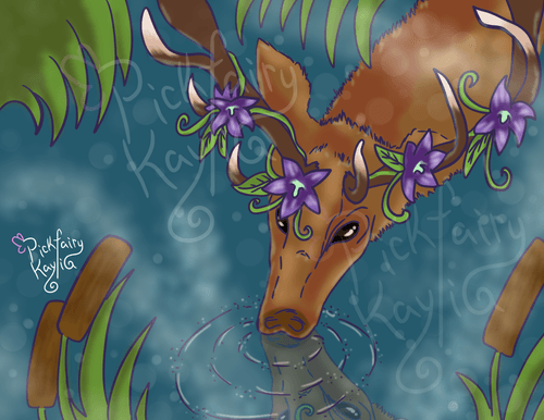 This monthly landscape challenge included a drawing of a deer drinking with flowers adoring his antlers as a cosmetic effect. There's cattails as the foreground just for decoration. Soft ripples are around the deer as it drinks from the water; a soft reflection is mirrored within the water for effect. This print will be 8 by 10 against 8.5 by 11 on cardstock fully colored.